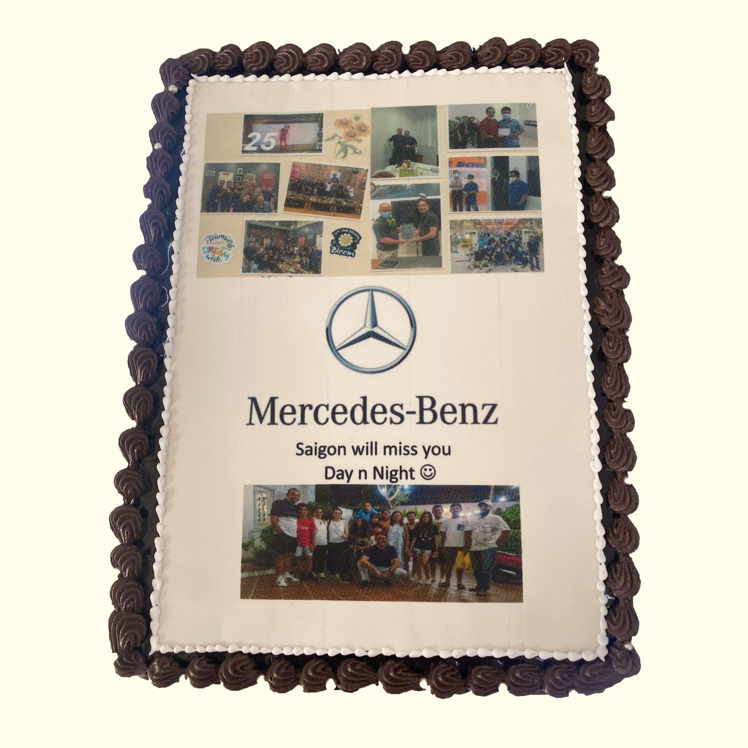Decorated with a beautiful edible photo collage and the iconic Mercedes-Benz logo, this elegant rectangular cake is bordered with rich chocolate piping. Perfect for corporate send-offs or retirements, its a meaningful and delicious way to say goodbye and celebrate shared moments.