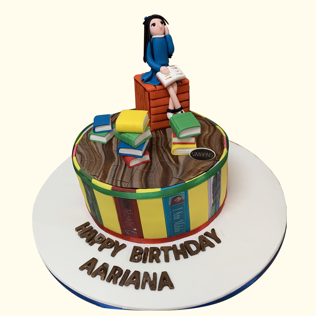 Featuring a fondant girl sitting on a stack of books surrounded by colorful books. This vibrant cake is perfect for any avid reader.