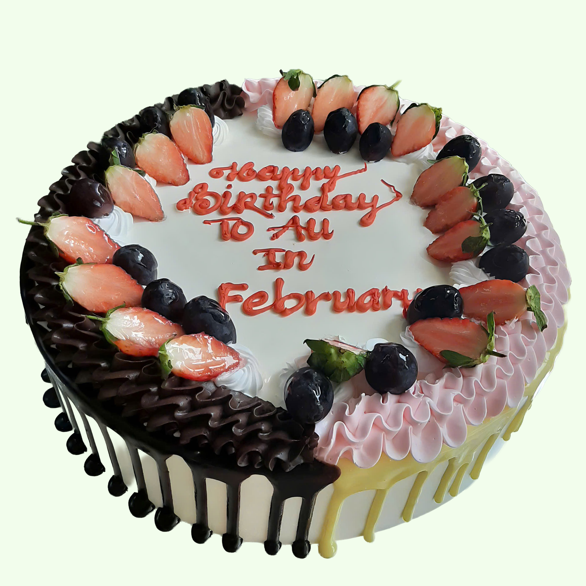 This delightful birthday cake is topped with generous mix of strawberries and grapes.