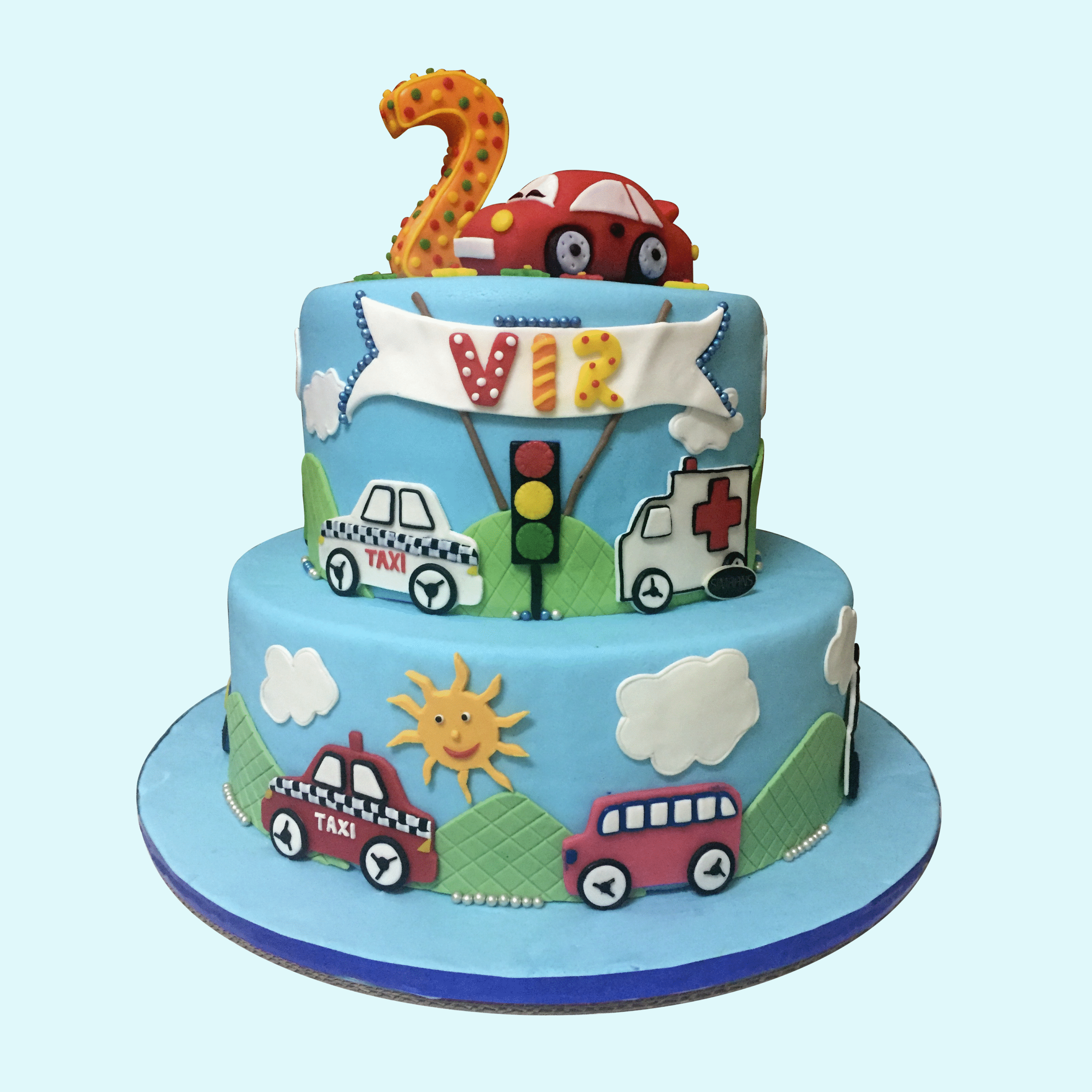 This fun, vibrant cake is decorated with colorful vehicles, road signs, clouds and a cheerful sky theme. Great for birthdays, or any transport-themed celebration!
